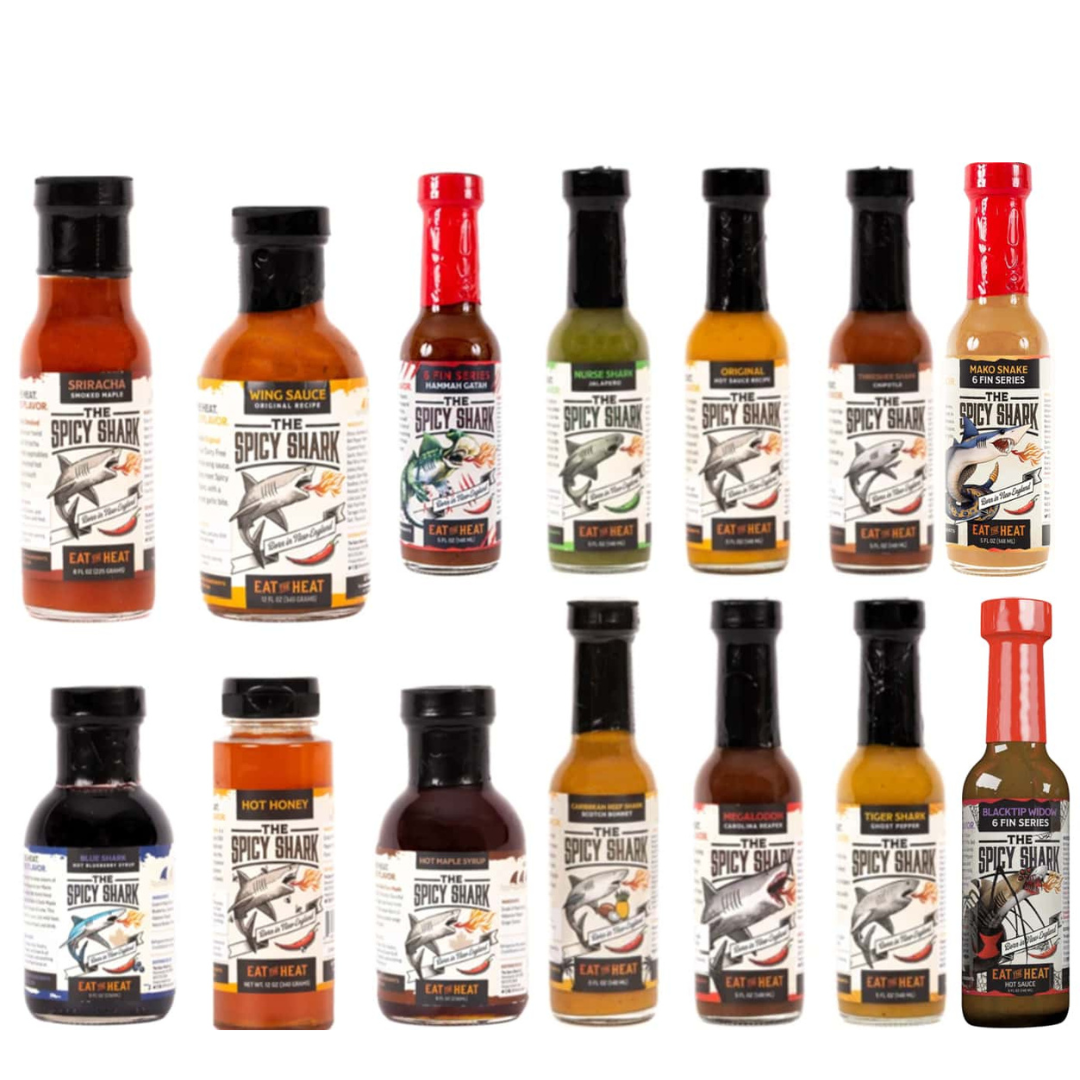 Enjoy all 14 sauces that we make with free shipping! Hot Honey, Hot Maple Syrup, Hot Blueberry Syrup, Smoked Maple Sriracha, Wing Sauce, Thresher Shark Hot Sauce, Nurse Shark Hot Sauce, Original Hot Sauce, Caribbean Reef Shark Hot Sauce, Tiger Shark Hot Sauce, Megalodon Hot Sauce, The Hammah Gatah, The Blacktip Widow, and The Mako Snake (as seen on Hot Ones).
