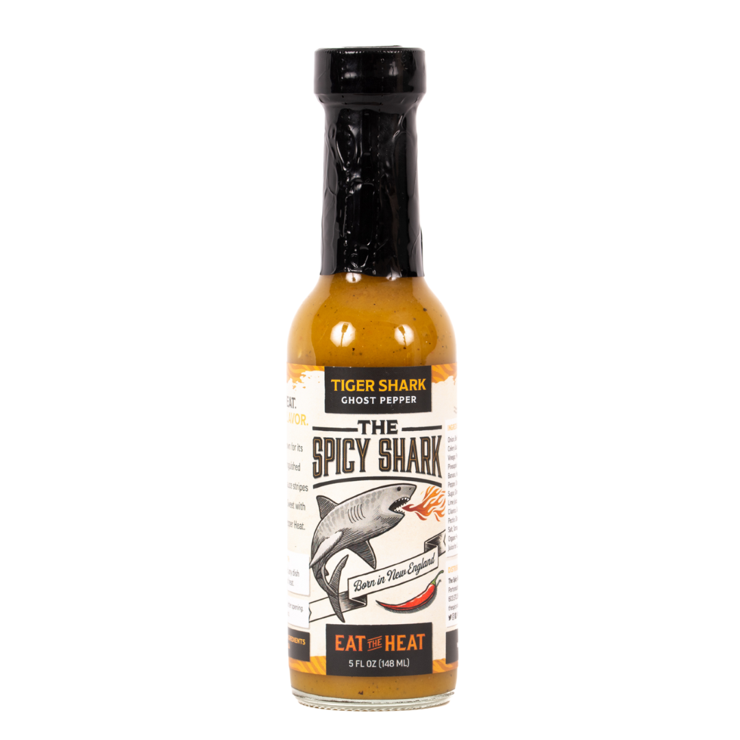 The Tiger Shark is known for its diverse diet and distinguished markings. This Level 4 (out of 5) sauce stripes Pineapple and Banana Sweet with Habanero and Ghost Pepper Heat.
